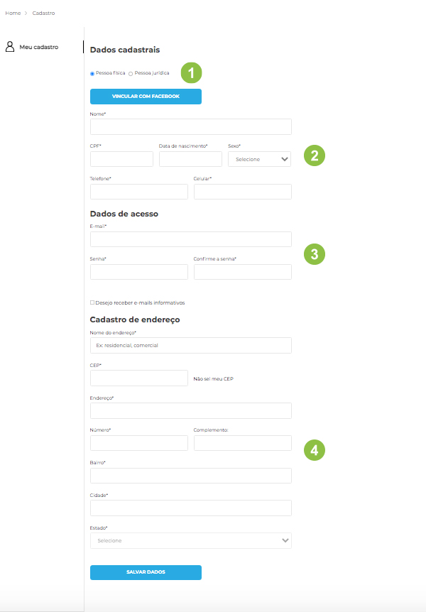 1. Clique em “Minha conta” e em seguida em ‘’Meu cadastro’’